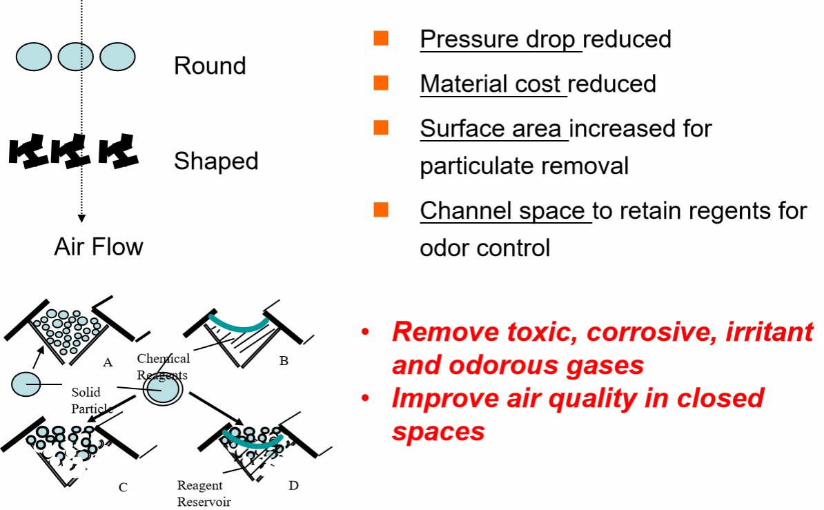 他通过包覆化学药剂(US06398039-B1, US2006086366-A1; US 07832412-B2),得到高效的环境治理用去除硫化氢、二氧化硫、醛类、胺类、酸类等的空气净化膜产品(US 06302932-B1;US07370657),应用于FRAM(R)车用过滤器和Advantage(R)纤维产品,年销售超过亿美元。