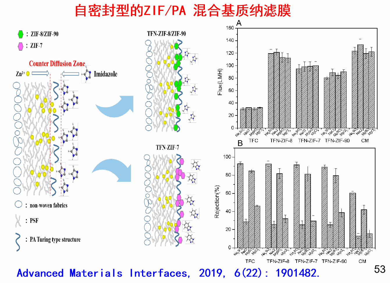 他通过在界面聚合中引入过渡金属二价离子盐,成功实现了聚酰胺分离层纳米孔径大小的连续调控(JOURNAL OF MEMBRANE SCIENCE 2021),而且通过耦合反向扩散ZIF纳米粒子的原位生长,实现了纳米孔径的自密封。在保持高膜水通量的条件下,提升膜的盐截留性能。(Advanced Materials Interfaces, 2019)。
