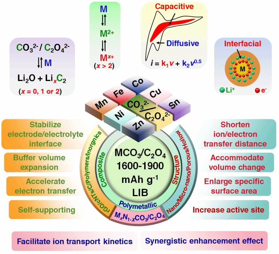 王舜教授和赵世强副教授研究团队基于课题组研究基础(在相关课题发表第一/通讯作者SCI论文10余篇)及文献调研,总结提出了MCO3/MC2O4负极的三种理性增效策略和四种新颖储能机理,并深入剖析了增效策略的作用机理和新颖储能机理的研究发现,并对MCO3/MC2O4负极的结构组成设计、储能机理探究和产业开发挑战等理论及应用研究提出了展望。