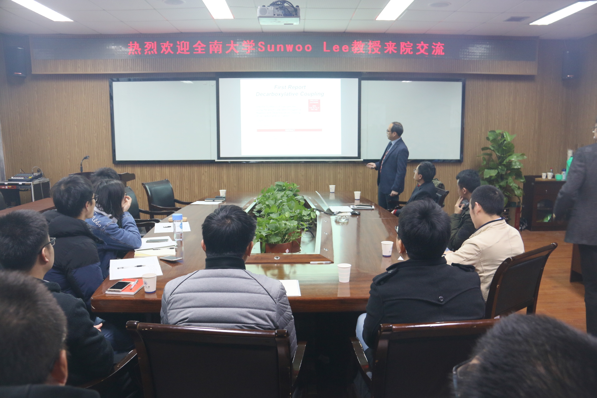 Sunwoo Lee教授介绍了韩国全南国立大学的现状,特别是关于各个学院的研究特色以及与中国等开展合作的情况,讲解十分详细。随后Lee教授作了题为“Transition-Metal-Catalyzed Decarboxylative Coupling Reactions”的学术报告。他在报告中系统地介绍了其课题组在过渡金属催化的脱羧偶联反应方面的研究成果,内容十分精彩。