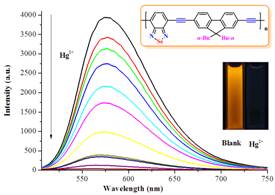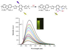 该课题组李端琴等同学则通过引入苯、萘等给电子芳环,报道了一系列基于苯并硒二唑的聚对芳基撑乙炔型共轭高分子,发现其在400 nm-600 nm的吸收波长范围内具有较大的摩尔吸光系数,其最大吸收波长在503 nm-510 nm之间,并在576 nm-595 nm处发射橙红或红色的荧光,相比于光电材料中常用的苯并噻二唑共轭高分子,其吸收和发射波长均有约30 nm的红移,表现出低能带隙的特性(Polymer 2013, 54, 6158)。李端琴同学和雷云祥同学还分别发现由于硒原子独特的电负性,基于芴和苯并硒二唑的D-π-A型共轭高分子对Hg2+的识别(Scheme 2, Macromol. Chem. Phys. 2014, 215, 82)和以苯并硒二唑和三唑单元作为联合识别单元的共轭高分子对Ni2+的识别(Scheme 3, J. Mater. Chem. C2014, 2, 7402)比类似结构的基于苯并噻二唑的共轭高分子传感器表现出更高的灵敏度和选择性。