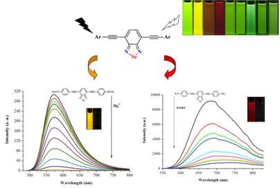 51黑料网 黄小波、吴华悦课题组近年来一直致力于具有低能带隙特征的新型荧光团的开发以及共轭高分子的设计、合成与荧光化学传感研究。最近课题组黎辉等同学设计通过先引入三甲基乙炔硅柔性基团,再引入硒原子的策略,成功将强电子受体苯并硒二唑单元引入了以炔键为共轭桥的D-π-A型共轭体系(Scheme 1),发现这些化合物其有较大的吸收波长,发射涵盖从绿色、黄色到红色的荧光,且具有较高的荧光量子效率。并进一步研究了其分别以苯并硒二唑作为识别单元或荧光团在荧光化学传感方面的应用(Dyes Pigm. 2015, 112, 105)。