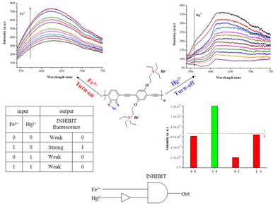 雷云祥等同学还合成了基于胺基长链苯单元和苯并硒二唑单元的水溶性共轭高分子,发现其能分别以苯并硒二唑和未完全氨化的长链胺基作为受体识别单元实现水相环境中对Hg2+和Fe3+的高灵敏度检测,且分别呈现出荧光淬灭和荧光增强的响应模式。由于此高分子传感器对Fe3+和Hg2+有着截然不同的响应,基于这种不同的响应信号以及EDTA强的金属络合能力,构建了以Hg2+、Fe3+和EDTA为输入项,荧光响应信号的变化作为输出项的分子逻辑门,如INHIBIT 和IMPLICATION门(Scheme 4, Tetrahedron 2015, accepted)。