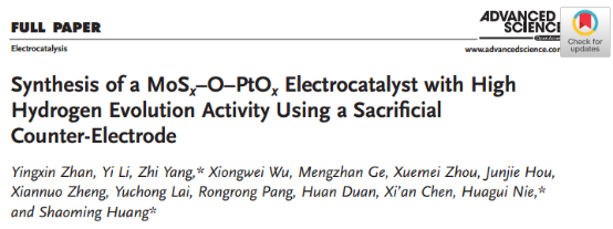 Yingxin Zhan, Yi Li, Zhi Yang,* Xiongwei Wu, Mengzhan Ge, Xuemei Zhou, Junjie Hou, Xiannuo Zheng, Yuchong Lai, Rongrong Pang, Huan Duan, Xi’an Chen, Huagui Nie,*and Shaoming Huang*, Synthesis of a MoSx–O–PtOx Electrocatalyst with High Hydrogen Evolution Activity Using a Sacrifcial Counter-Electrode, ADVANCED SCIENCE,2019, DOI: 10.1002/advs.201801663