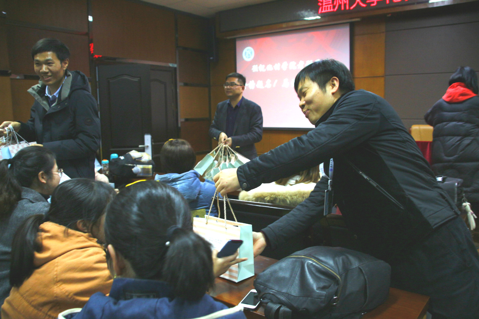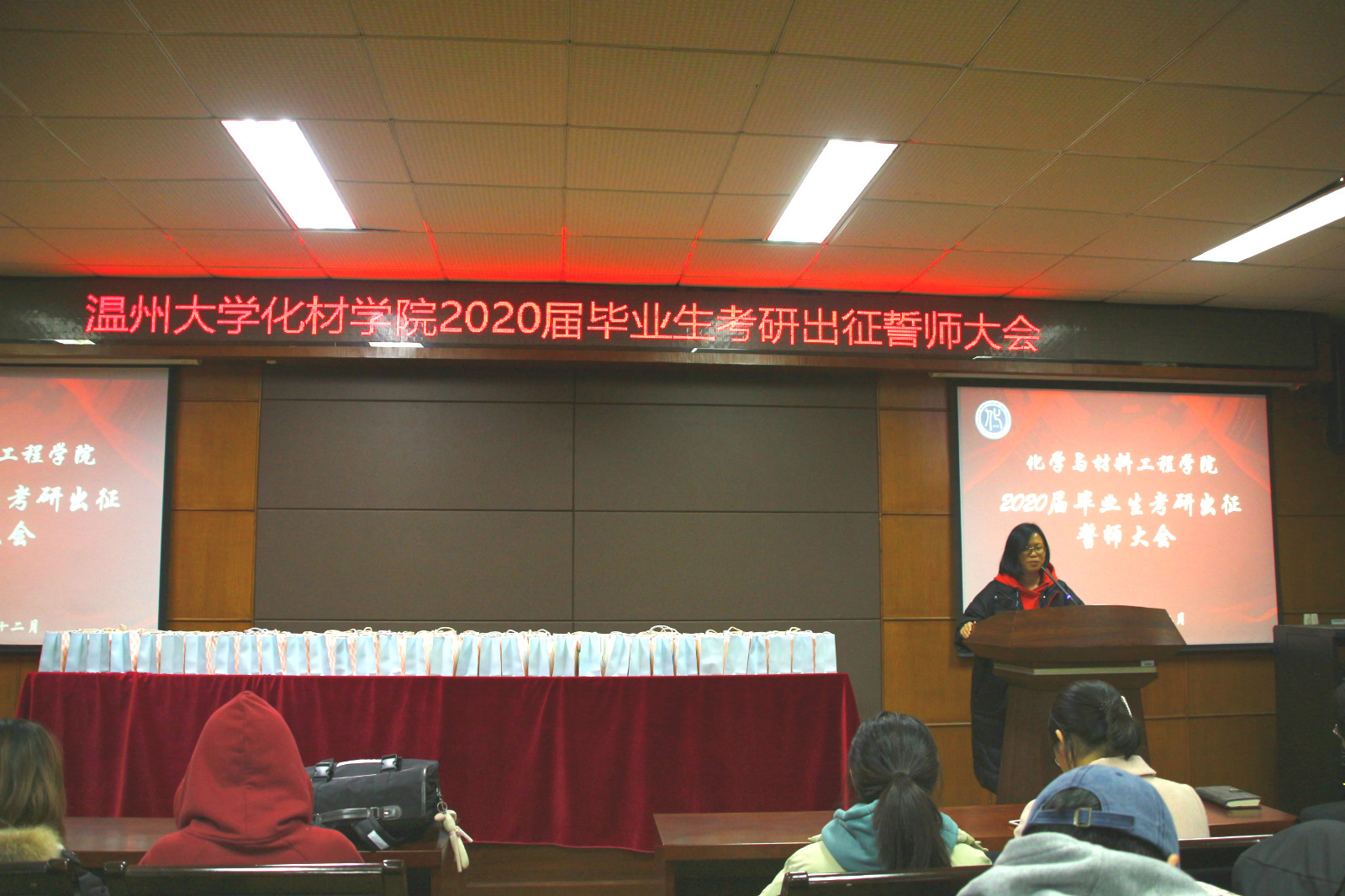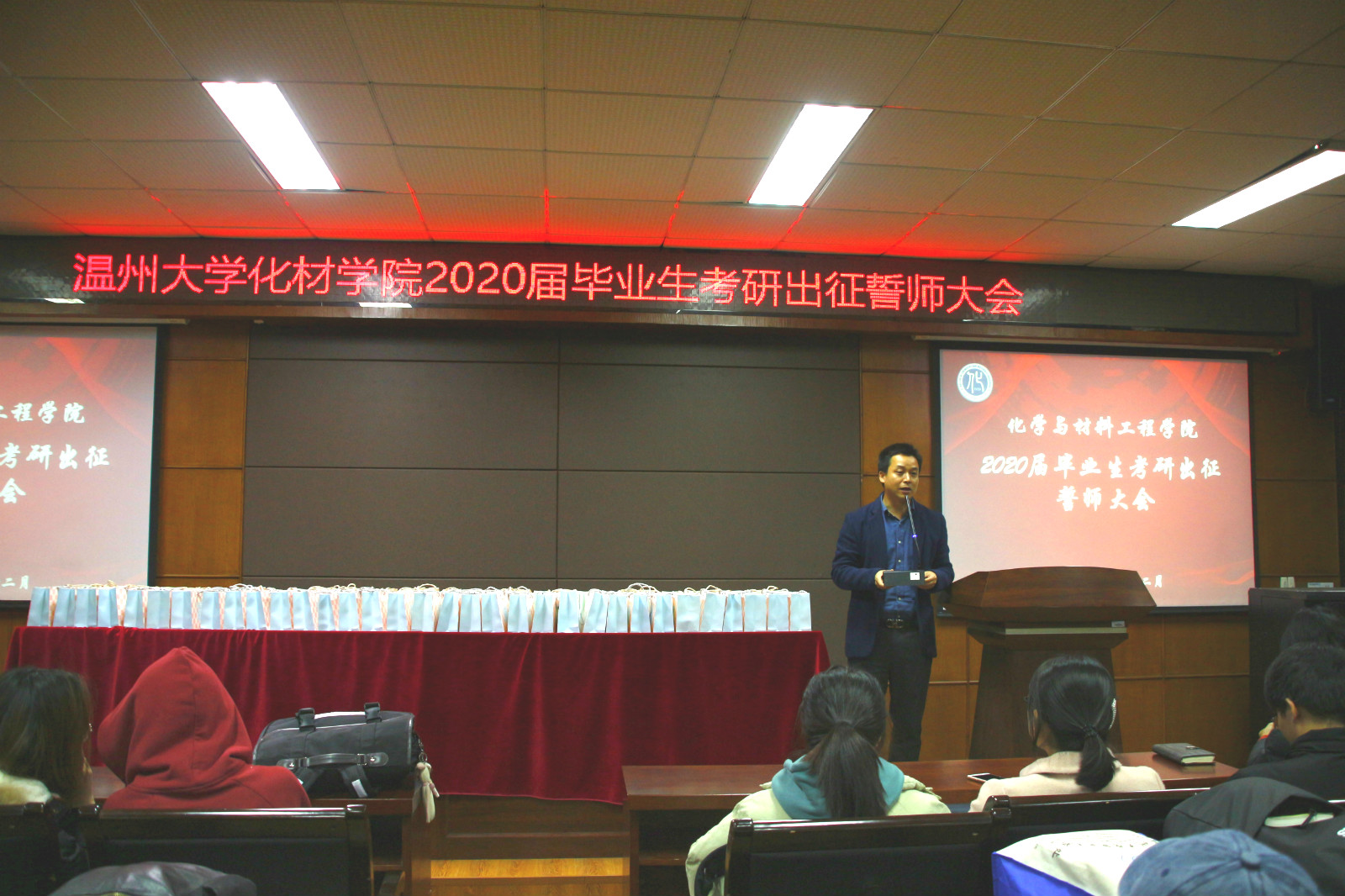 考研大会在激昂的音乐中拉开帷幕。会上,首先播放了一段承载着各位老师和化材全体同学的祝福视频。