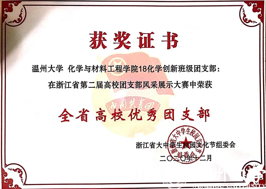 18化学创新班团支部荣获全省高校优秀团支部。