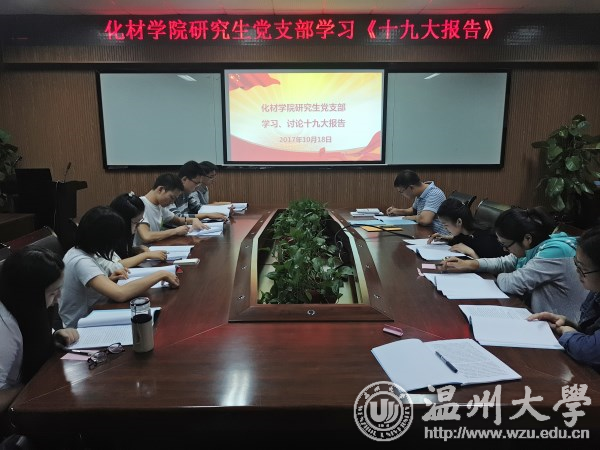 研究生党支部认真观看了中国共产党第十九次全国代表大会开幕会,仔细聆听了习近平总书记的报告。当天晚上7点,在支部指导老师邹涌彬的带领下,2017级研究生党支部党员开展了《十九大报告》的学习。