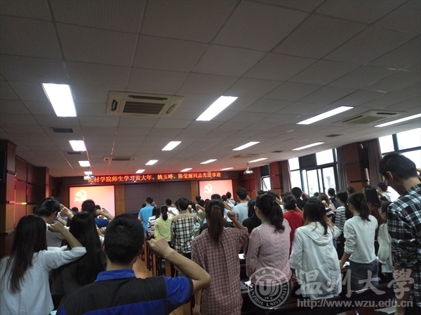 邹涌彬老师首先通报了到会情况,介绍了本次主题党日活动的主题、内容和流程。会议严格落实温州市委组织部“六制六规范”的要求,全体党员佩戴党员党徽,诵读党章,重温入党誓词。会议学习了党的十九大召开相关背景知识,观看黄大年、姚玉峰、陈莹丽同志先进事迹、浙江先进人物季庆泉、潘宝良同志微电影。