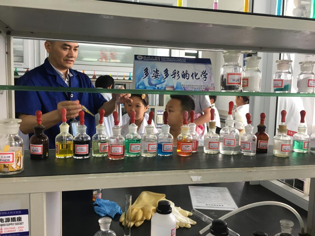 共同举办了第四期实验室开放日活动,邀请学校教职工子女进入实验室体验生活中的化学,为小朋友们送上”六一”儿童节礼物。当天上午,校工会主席张希均老师,学院党委书记方乐平老师,学院工会主席陈锡安老师、化材学院实验中心教工党支部书记刘妙昌老师及其支部党员教师与大学生志愿者来到现场。
