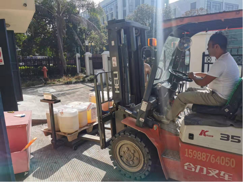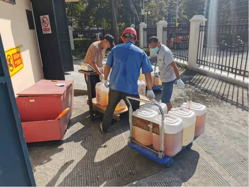 2021年9月29日早上8:00,处置公司人员进行废液测试,以有效保障废液转运过程的安全。经过磅、装运、交付危废转运联单后,于中午10:40顺利离校。此次实验室废弃物共转移处置有机废液、无机废液等共计7.111吨,其中生环学院0.42吨。