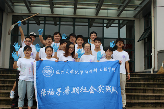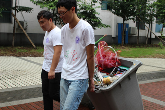“绿袖子”暑期实践队的成员帮助学院的管理员清理垃圾,清理草坪。
