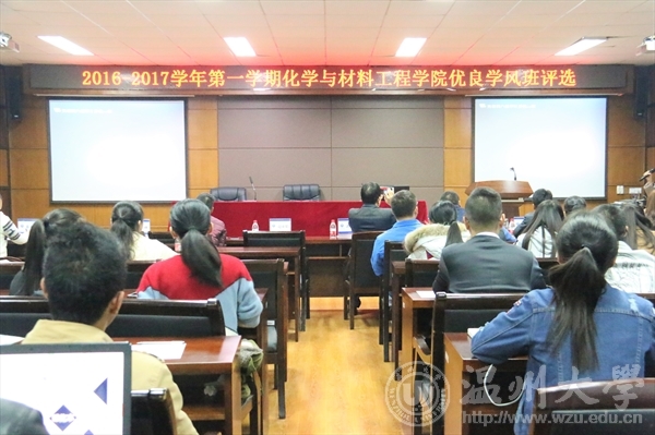在11B208室举行了2016-2017学年第一学期“院优良学风班”现场评比活动。学院党总支副书记潘从义、化工系主任徐进老师、化学系副主任徐清老师、应化系主任赵亚娟老师、材料系副主任刘若望老师、学生科科长王壮老师、蔡玲飞老师以及杨程程老师等共8位老师出席活动并担任评委, 40余名班级学生代表担任大众评委。