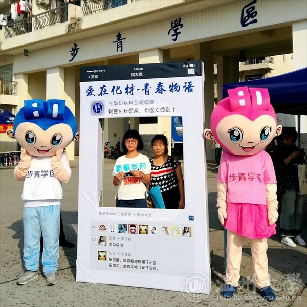 在现场报道点为新生们定制的合影相框服务表示了肯定。新生们可以挑选“春风十锂,化材等你”等带有化学元素的祝福语与家长一起合影寄语大学生活!