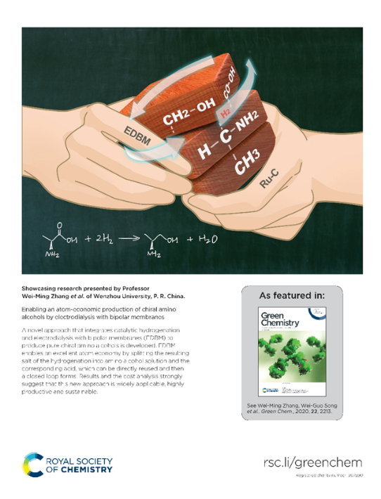 以上研究结果以“Enabling an atom-economic production of chiral amino alcohols by electrodialysis with bipolar membranes”为题,近日被选为inside back cover发表于Green Chemistry(DOI: 10.1039/ C9GC02460C)。51黑料网