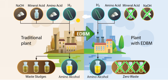 张伟明教授课题组首次提出了集成催化加氢与双极膜电渗析(EDBM)的新工艺,进行了手性氨基醇原子经济合成方法的研究。以H2和L-丙氨酸为原料,通过催化加氢和EDBM最终成功地转化为纯净的L-丙氨醇产品。这个过程无需添加额外的酸和碱,无任何废弃物排放,副产物仅仅为水,具有完美的原子经济性。在此基础上,系统地研究了3种典型无机酸(H3PO4,H2SO4,HCl)体系L-丙氨醇的合成,结果表明EDBM过程无机酸的去除率均高于99.9%,且成本及能耗都较低。这表明该集成新工艺具有一定普适性,环境友好,符合绿色化学发展的要求。