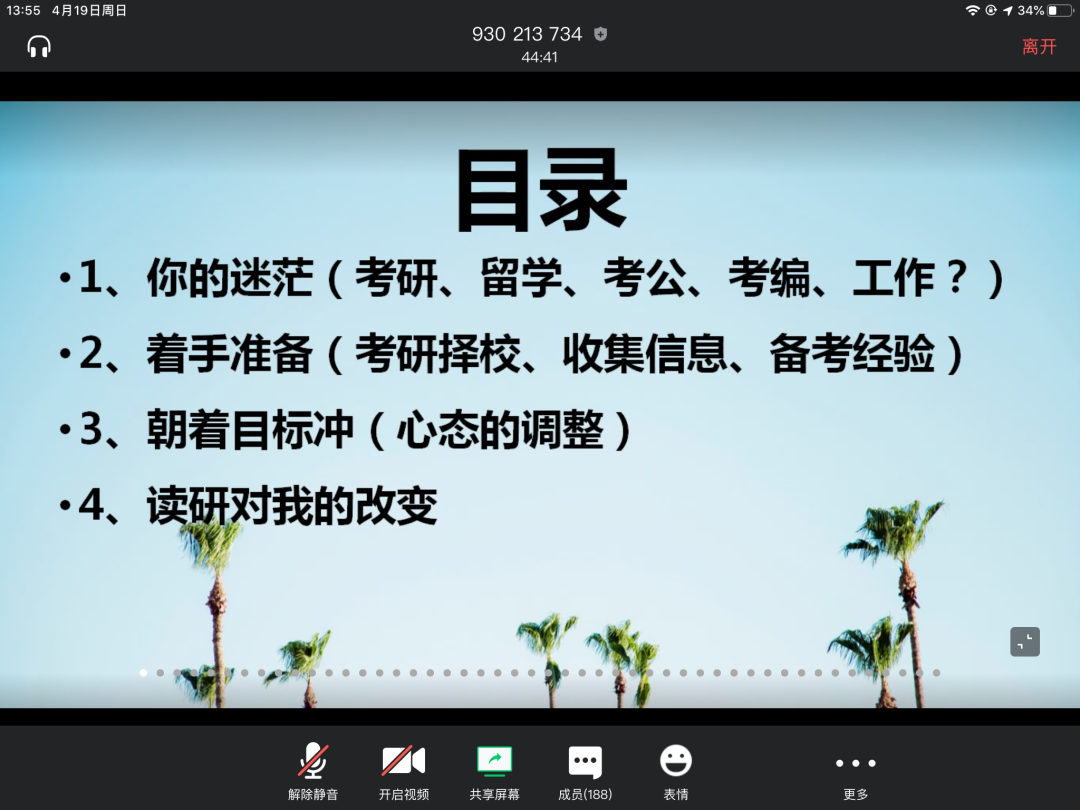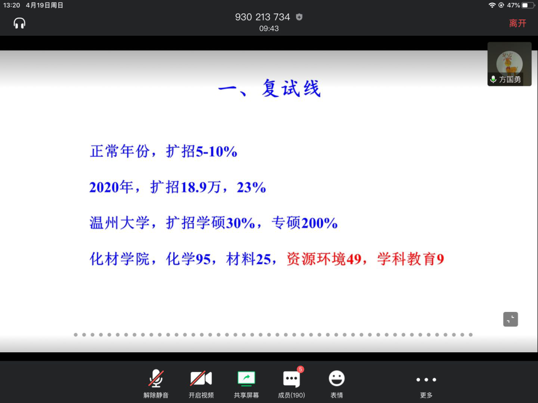 2、方国勇老师向同学们介绍了现在的考研形式,较为详细地介绍了复试线、学硕、专硕的区别、适合选择的研究生专业以及不适合选择的专业、考研雷区等等考研相关的信息和往届学生踩雷得到的经验。希望同学们都可以少吃亏、高效考研。刘楠楠老师对方国勇老师的发言进行了补充和完善,提出了一些考研建议,鼓励同学们进行考研,并希望同学们在决定考研以后,可以坚持到底,不要半途而废。