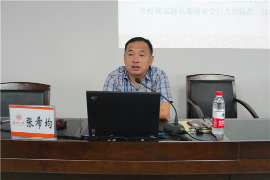 随后张希均处长上台。张处长由大学校园中的政治安全,人身安全,财物安全,心理安全,法律安全展开话题。张处长首先提出高校的安全形势不容乐观,部分大学生法制观念淡薄防范意识不强,安全意识匮乏,还需要加强安全教育。对于预防网络、推销等诈骗案件,张处长强调遇事要不慌、不怕、不贪,与陌生人交流要提高警惕,不要轻易相信陌生人。 关于财务安全,张处长提到我们需要做好以下三点来保证自己的财务安全。首先,要妥善保管好自己的现金和贵重物品。其次,离开寝室时一定要把门锁好,防止盗贼入内。最后,无论在运动场,食堂,还是图书馆,尽量不要让物品离开自己的视线。