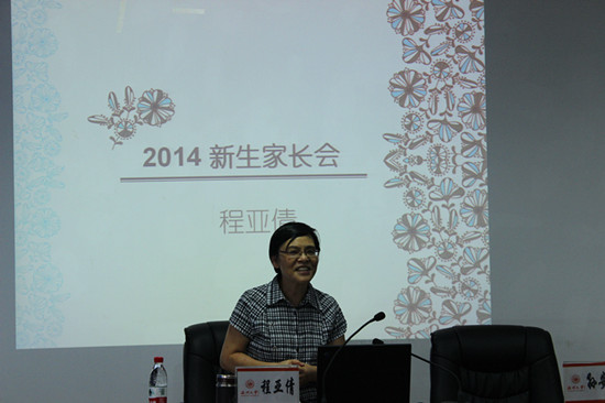 会议伊始,程亚倩书记发表讲话。程书记先向各位家长详细地介绍了学院雄厚的师资力量,先进的仪器设备及优质的教学条件等情况。之后,她向14届学生提出了三个基本要求:第一,培养自信、自立、自强、积极向上的生活态度;第二,坚持体育锻炼,培养起很好地适应环境适应社会的能力。第三,学会做人,学会宽以待人、严于律己,学会学习。同时也希望家长能够协同老师们做好对子女的教育,需向孩子强调在校要做到遵纪守法,坚决不能违反校纪校规,更要注意安全问题。另外,在一个学期后将会面临转专业的问题。这既是一次机遇也是一次挑战,希望学生能够全面考虑,谨慎选择。
