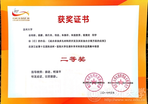 金杨新、姜鹏、熊丹凤、倪佳、朱惠伶、朱殷胜男、程费欢同学的作品《疏水亲油多孔材料的开发及其在油水分离方面的应用》(指导教师:徐进、柯清平)荣获决赛二等奖。