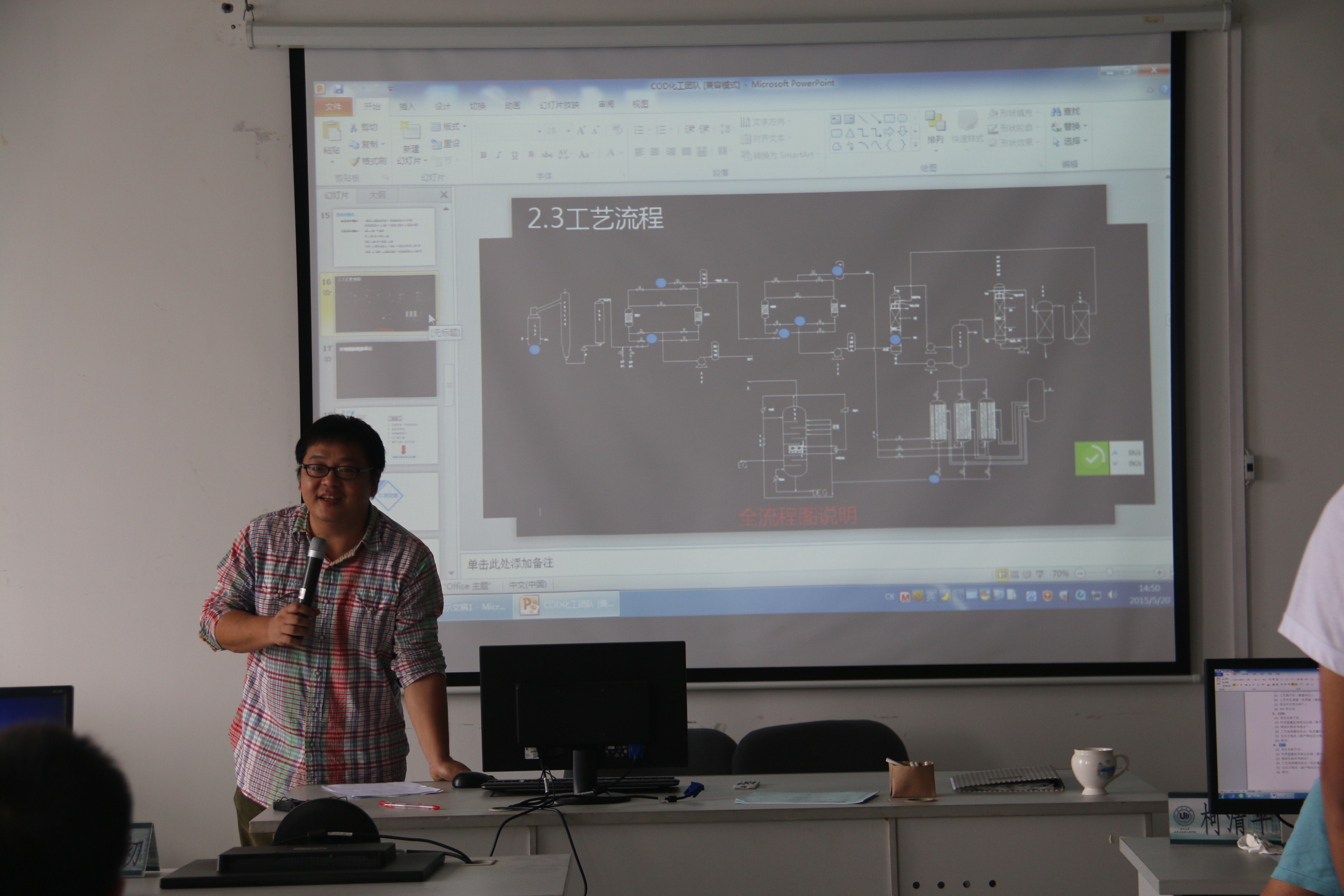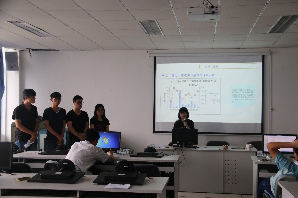 的PLUS团队由5位大三的同学组成,有了去年的比赛经验,他们更加熟练和有默契地用PPT展示他们的设计方案,分别从项目背景、工艺介绍、厂址选择、环境分析、项目总结五方面来陈述。老师们对此有较高的评价,但是也提出了一些建议,希望同学们化工术语的表达和设计图的绘制能更加规范。瓯江学院的COD团队以合理明确的分工陈述方案被评为老师们夸奖很有团队精神。徐进老师也指出,做一个设计方案是个学习的过程,在一个团队里,大家都要表演好自己的角色。