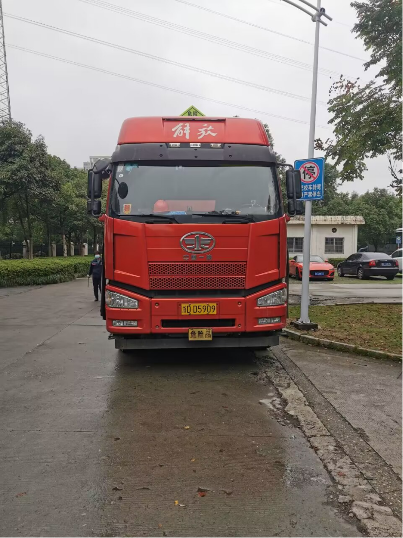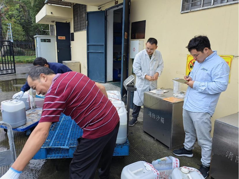 11月25日上午9:50开始,经过磅、装运、交付危废转运联单后,危险品运输车辆于上午11:10顺利离校。此次实验室废弃物共转移处置有机废液、无机废液等共计4.741吨。