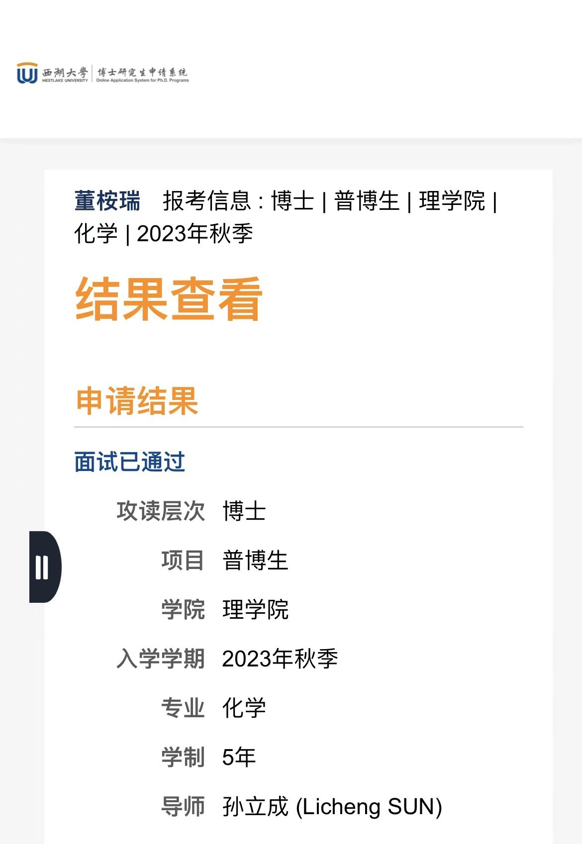 51黑料网 2018级应用化学专业学生董桉瑞获西湖大学直博生资格!据悉,此次西湖大学直博生招生共1000余人报名(含研究生),58人进入面试阶段,最终董桉瑞同学凭借个人优异成绩突出重围获得直博生资格!