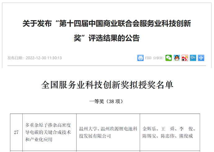 金辉乐、王舜、李俊、陈锡安等教师主持完成的“多重杂原子掺杂高密度导电碳的关键合成技术和产业化应用”项目获中国商业联合会服务业科技创新奖一等奖。该项目提出了多种多重杂原子掺杂高密度导电碳的关键合成技术,制备出多种高导电性、高密度、多级孔、多杂原子掺杂碳基材料,有效解决了常规碳材料因密度低、活性位点少而引起的体积容量和能量密度低、催化活性差等难题。