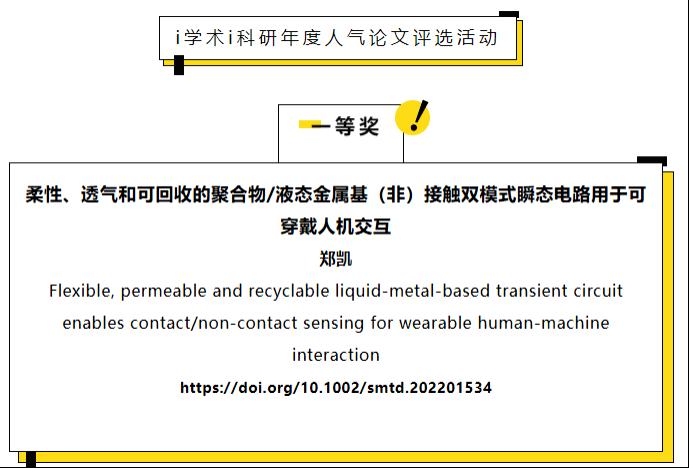 2023级研究生,导师为陈亦皇教授,于2023年2月以第一作者的身份在“Small Methods”(IF 15.367)上发表一篇SCI论文《Flexible, permeable and recyclable liquid-metal-based transient circuit enables contact/non-contact sensing for wearable human-machine interaction》;同期在柔性电子领域发表相关专利共2篇。该工作通过一种简单的策略制备了具有双模式响应、高透气性、高灵敏度、优越机械稳定性、优良导电性和可回收的柔性瞬态电路。该电路具有高分辨率(100 μm)和优越的导电性(2.5×105 S/m),在常规变形时表现出优越的导电性和优异的机械耐久性(10000次)。所制备的传感器具有1.24 kPa-1的高触觉灵敏度,同时具有出色的非接触传感性能,这是目前报道的先进双模式系统(通常< 1MPa-1)所无法达到的。为了说明其实用潜力,证实了其在接触模式下的信息传输、位置验证和压力可视化能力,以及非接触模式下的空间(如方向、距离和角度)和材料(如数量、成分和运动)识别能力。并且该柔性电路表现出高效的可回收性(92%),促进了可持续发展和环境保护。