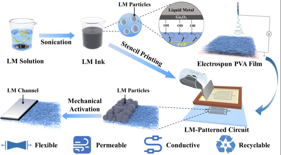 Figure 1. Schematic illustration of the fabrication process of the LM-patterned transient circuits on the electrospun film.