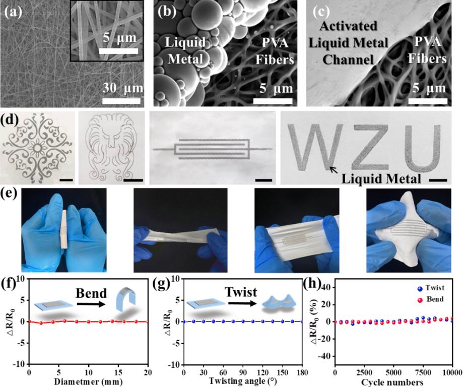 Figure 2. Characterization of LM-patterned circuit on electrospun PVA film