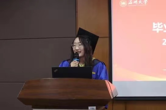 2023届研究生毕业生代表20级研究生孙秋红代表全体毕业生向学院提供的平台、老师们的悉心指导、朋辈之间的互帮互助表达了最诚挚的谢意。并祝福了所有的毕业生们在未来的日子里不忘星光与理想,在各自的征途上畅行无阻,此去乘风,一切顺利,在未来相见于更高的平台。