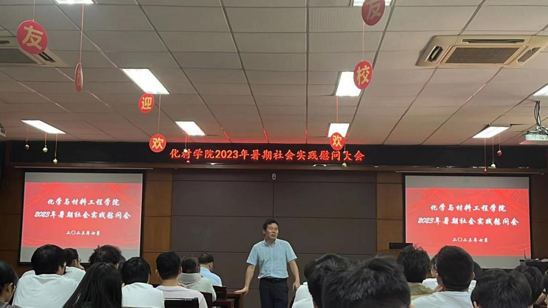 暑期社会实践慰问大会在11B208会议室举行。学院党委副书记周敬业、各实践队的指导老师肖洪平、彭旭锵、李政、李国朋、潘飞,以及化材之光、南星、绿向导三支暑期实践队的成员参会。
