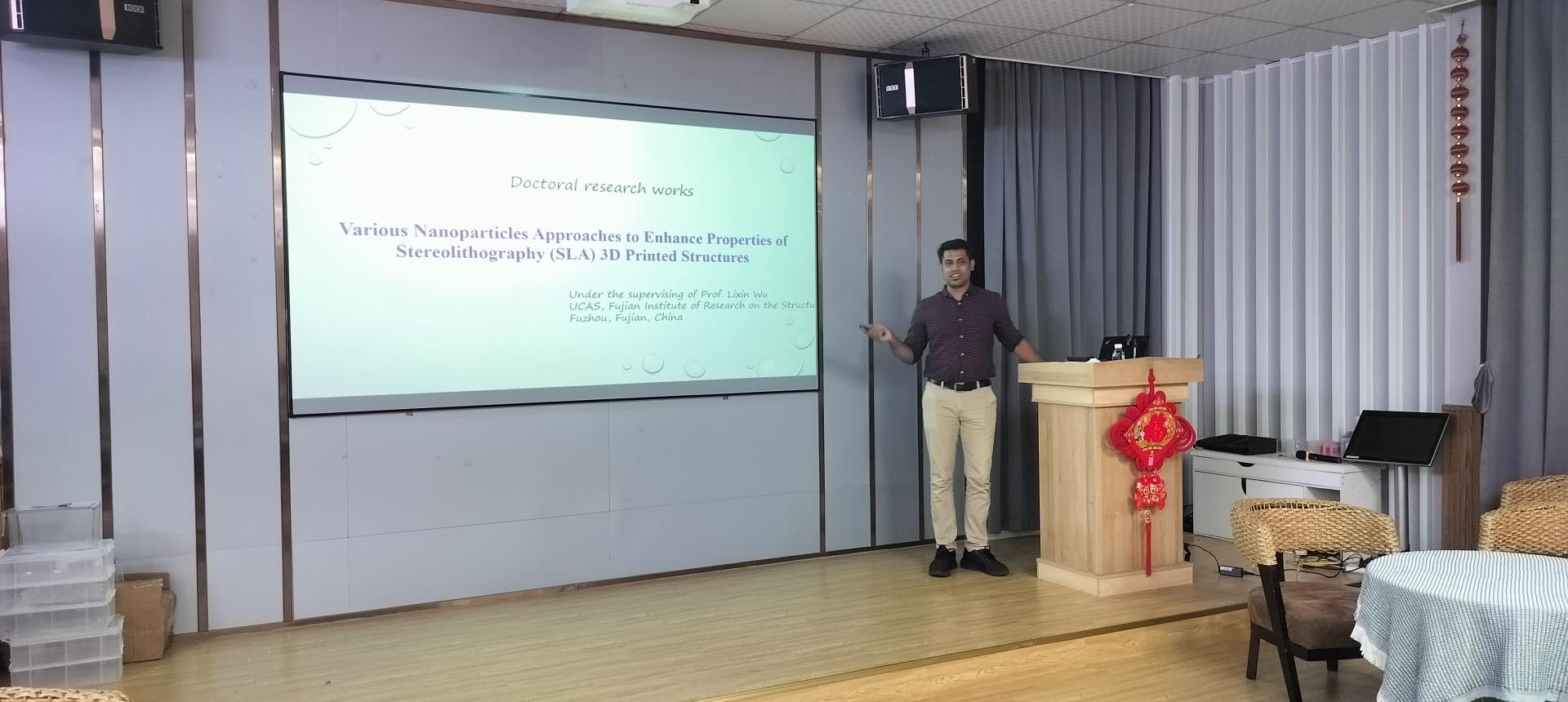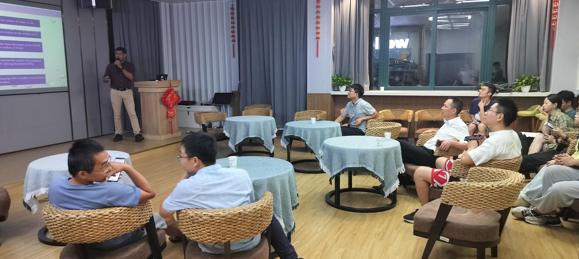 讲座中Suhail Mubarak Puthan Peediakkal Valiyakath博士重点分享了他的研究工作“压电纳米发电机用电纺聚偏氟乙烯-镁铬纳米纤维”