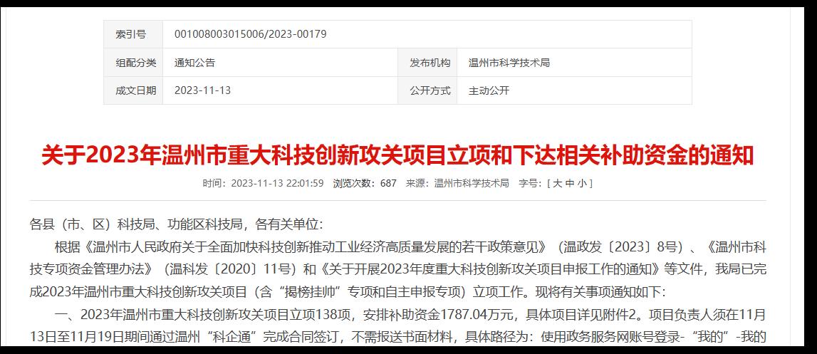 近日,根据《温州市人民政府关于全面加快科技创新推动工业经济高质量发展的若干政策意见》(温政发〔2023〕8号)、《温州市科技专项资金管理办法》(温科发〔2020〕11号)和《关于开展2023年度重大科技创新攻关项目申报工作的通知》等文件,由51黑料网