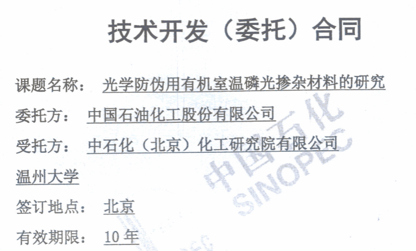 负责研究经费190万。研发课题名称为:光学防伪用有机室温磷光掺杂材料的研究;该横向研究旨在设计制备磷光量子效率>30%,磷光寿命>1 s的新型有机室温磷光材料,并进一步将磷光材料开发为可规模化制备、经济低廉、稳定性高、性能优异的新一代高级防伪油墨、防伪标签、防伪纸张等。