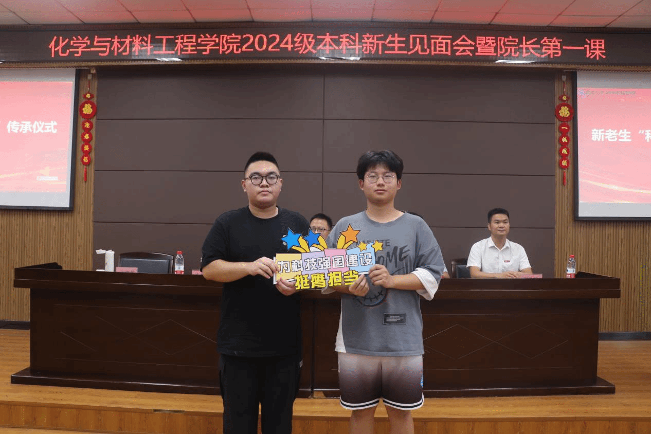 老生代表张宁宁将象征“科学家精神”的手牌传递给新生代表杨国鹏,以朋辈引领全体新生用心体悟科学家精神,坚定科技报国信念,以“双一流”自律和“高水平”努力奋力成长成才!