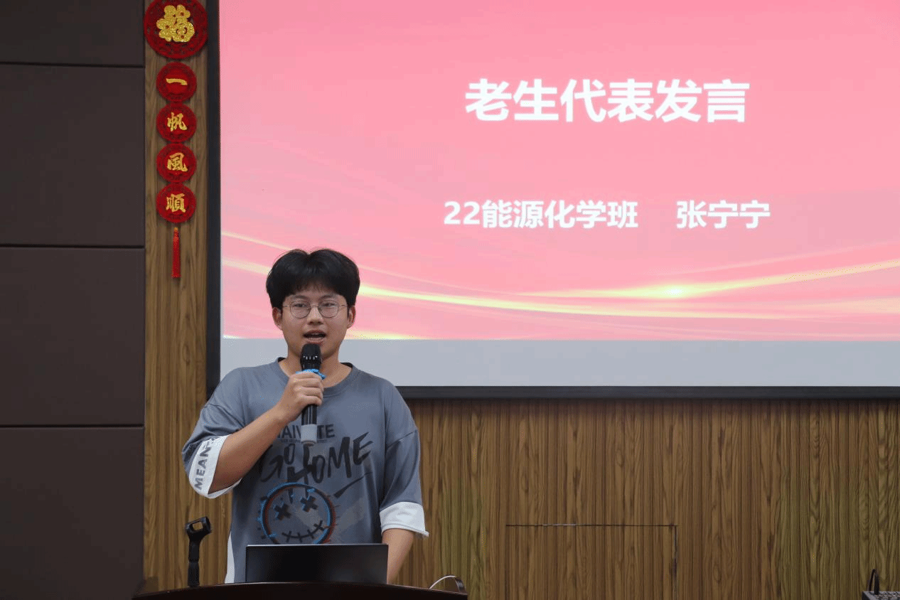 老生代表22能源化学班张宁宁同学发言,作为浙江省国际大学生创新大赛金奖团队的负责人,他从以赛促学、以学强研的角度出发,努力下好基本理论、综合能力、科研实践三个基本功,做同学们敢于“做梦”,坚持“追梦”,奋力“筑梦”的未来化学产业行业的拔尖人才!