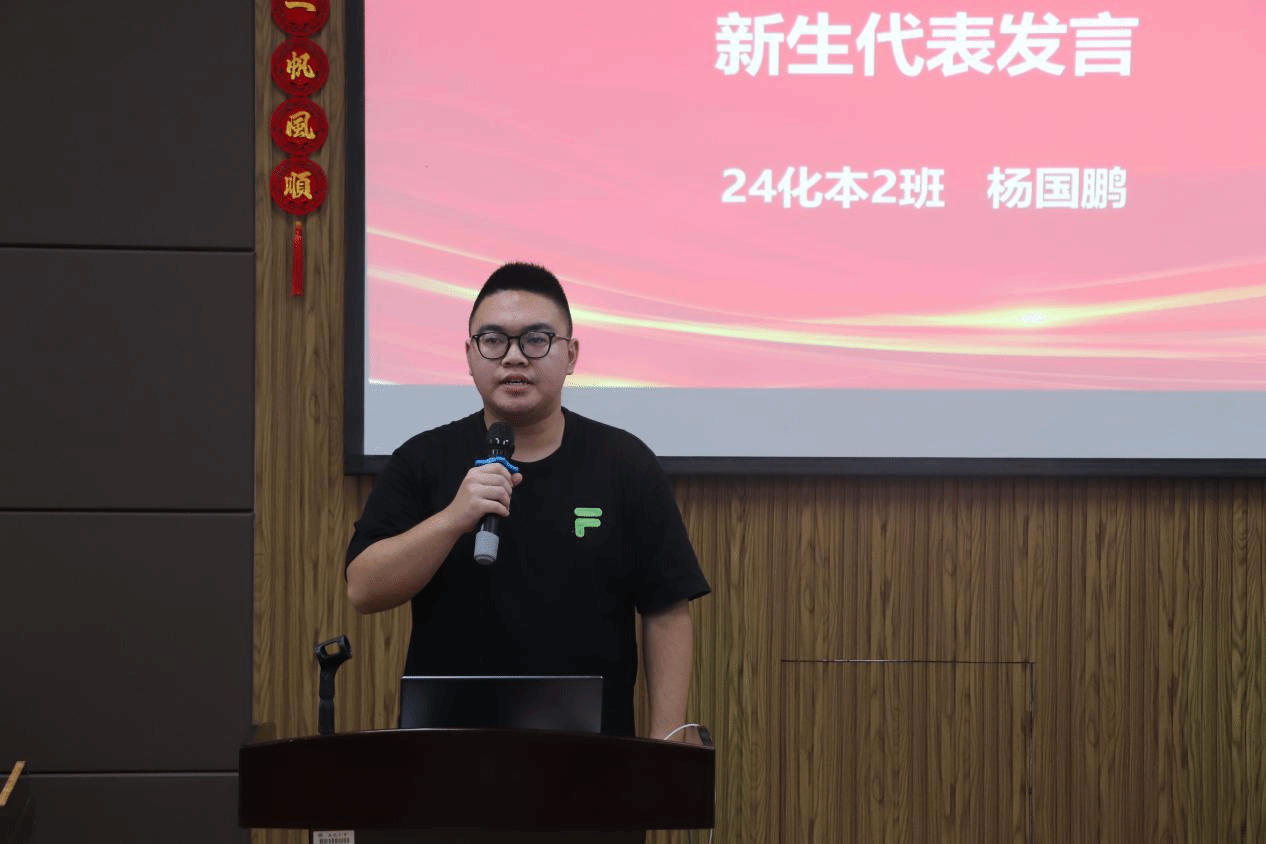 新生代表24化学(师范)2班杨国鹏同学发言。他和全体2024级本科新生共勉,要警惕“躺平”、“佛系”思想,在新阶段要善做自我规划的主导者,迅速完成角色转变、养成自律习惯、建立学习系统,争做科技报国的新青年。