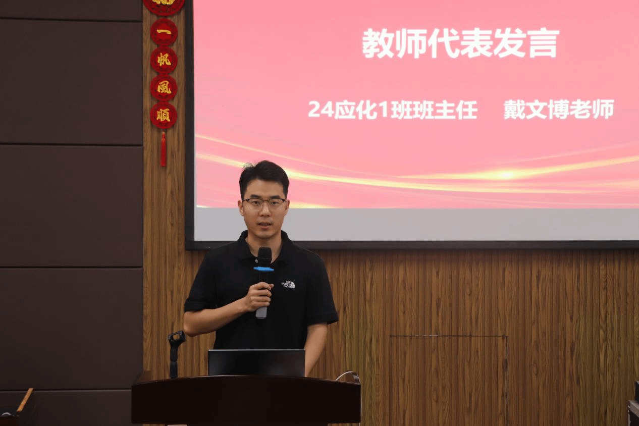 班主任代表戴文博老师发言。他从生活学习管理的视角切入,寄语全体新生注重生活平衡学习、持续学习深耕、奋力追求梦想,努力成长为在学业上有追求,在生活上有规划,在思想上有深度,在品格上有担当的新青年。
