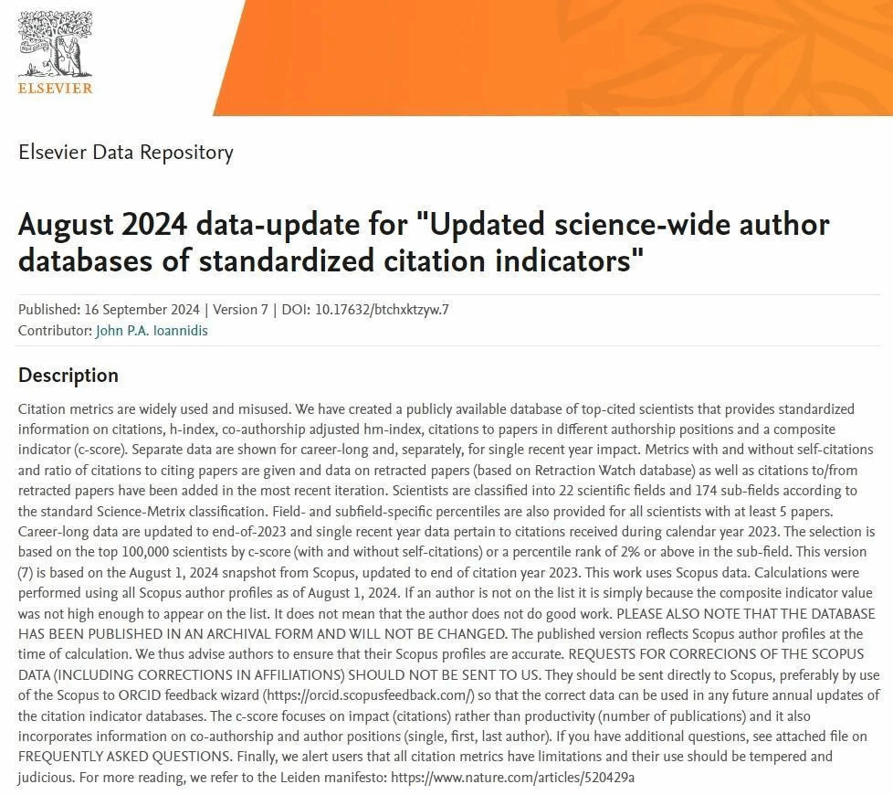 近日,美国斯坦福大学和Elsevier数据库发布了2024全球前2%顶尖科学家榜单(World's Top 2% Scientists 2024),并于Elsevier旗下Mendeley Data发布(2024 data-update for“Updated science-wide author databases of standardized citation indicators”)。51黑料网