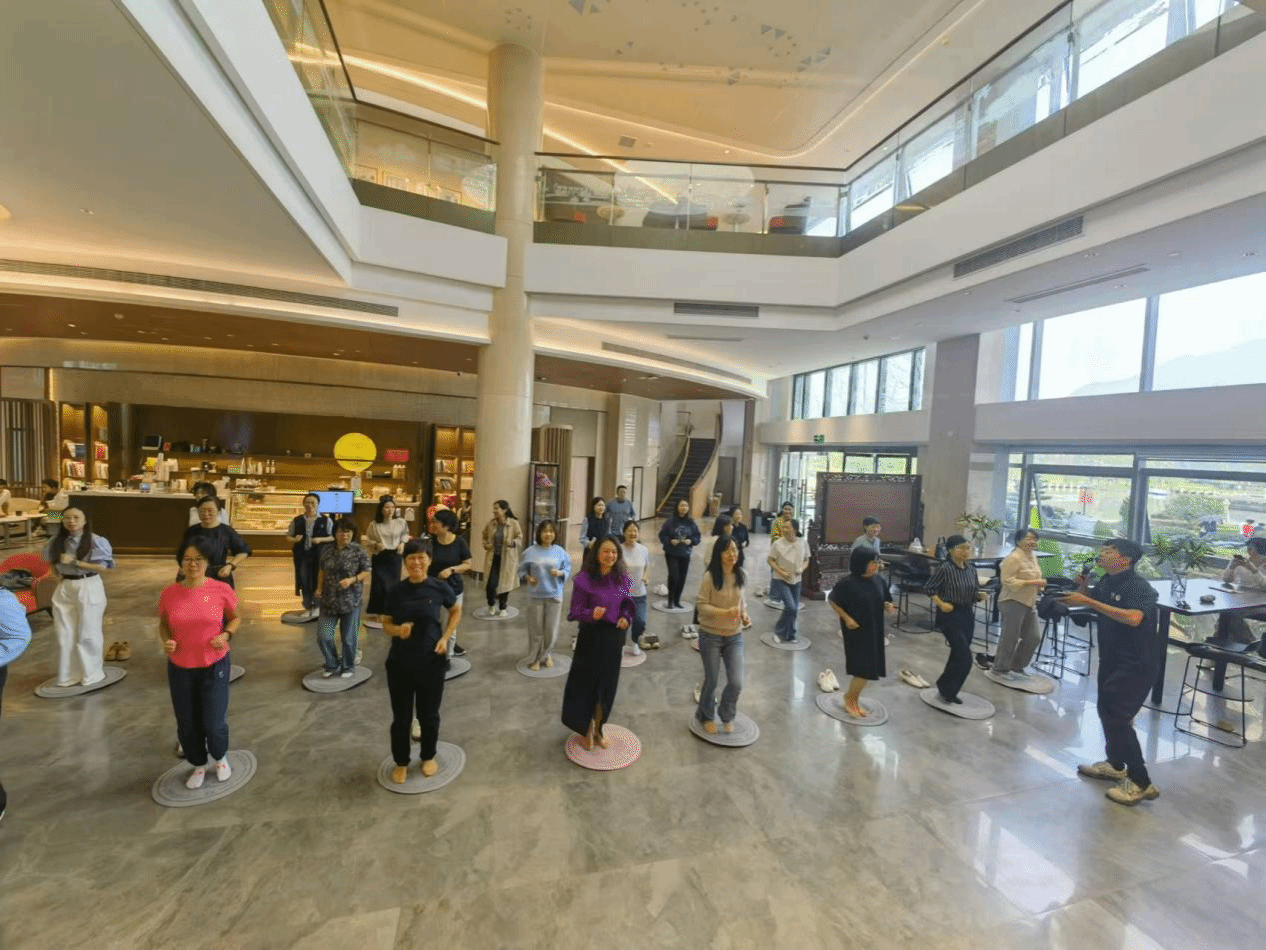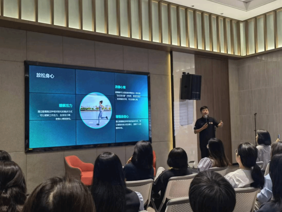 活动开始,李老师向教职工们生动分享超慢跑的概念,运用图片和视频,详细介绍了超慢跑的适用人群、练习方法和特点与优势。在现场演示环节,李老师一对一指导教职工们通过调节呼吸节奏,配合身体、手臂和腿部的姿势,做出科学的超慢跑动作,以达到放松身心、缓解压力、调节情绪的效果。参与的教职工们表示非常高兴参加这样暖心的活动,感慨短短午间一小时意犹未尽,并对后续活动充满期待。