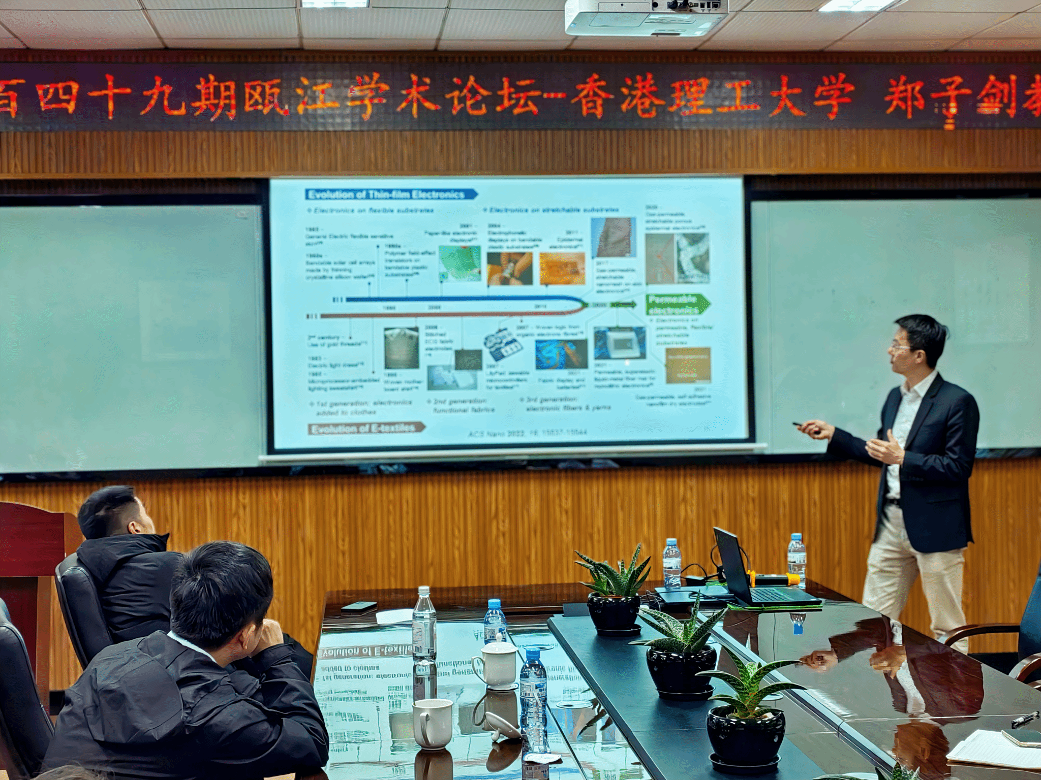 报告结束后,答疑交流环节,师生们踊跃发言,问题涉及科研、化学前沿发展等多方面。郑子剑教授均一一进行了解答。通过本次瓯江学术论坛的讲座,师生们既拓宽了知识面,对可穿戴电子产品的多孔导电织物方向的前沿研究也有了更深刻的理解。