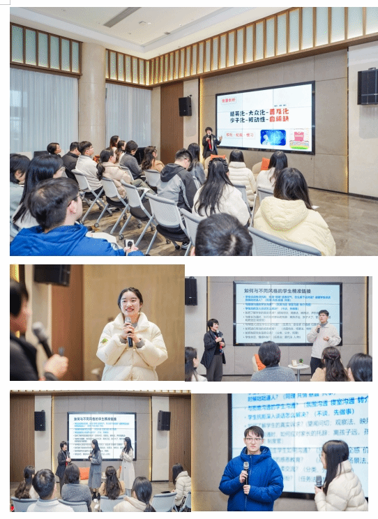 主旨分享会环节。王晓华副书记深入带领辅导员谈话赋能专题沙龙,共创属于自己的辅导员效能手册。她生动分享新时代育人新挑战、大学生特点演化趋势等,并提出了精准谈话中包含映照法、削薄法、愿景法、请教法等七大方法在内的分类处理策略。在场景重现模拟环节,辅导员们更是踊跃分享了各自在工作中遇到的谈话难题与困惑,作为课程案例。比如在面对性格内向且极度抗拒交流的学生时,不知如何破冰;还有在处理学生之间复杂的矛盾冲突时,如何洞察学生的真实诉求;另有情感纠纷及家校沟通等难题。针对这些问题,王晓华通过生动的案例分析与角色扮演,与参会辅导员们共创体验了不同谈话方式所产生的效果差异,共同探讨解决方案与应对策略,深刻理解了以学生为中心的谈话理念与技巧应用。最后还特别就导学关系链接艺术、女辅导员的生涯规划、“三一”压力舒缓平衡法等议题展开深度交流共创。