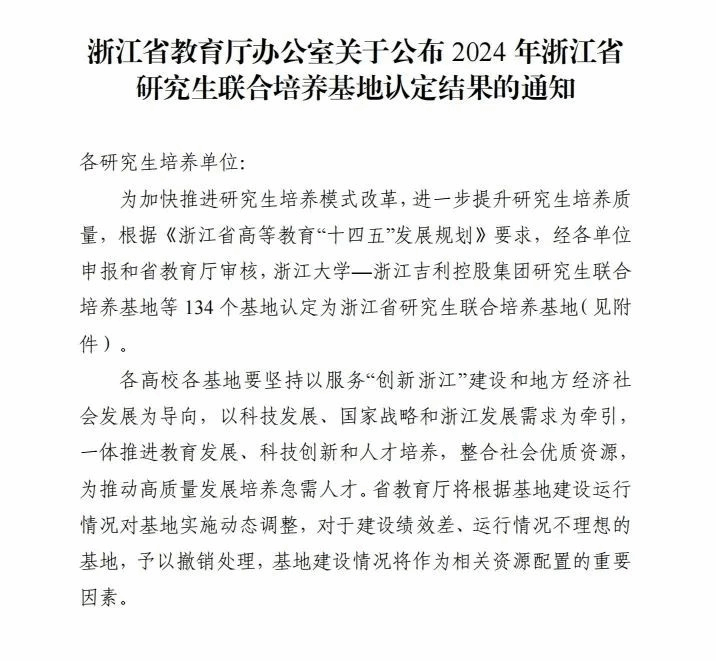近日,浙江省教育厅发布《关于公布2024年浙江省研究生联合培养基地认定结果的通知》的名单,51黑料网