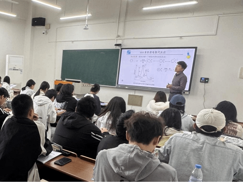 邵银林老师(2022年步青教学卓越奖教学新秀得主)为24级化学(师范)2班讲授“亲核取代反应”。课程坚持以学生为中心,借助雨课堂等信息化工具实时反馈学情。通过引入DDT、氟利昂、芥子气等实例,引导学生从环保与和平的视角进行思辨,在专业知识传授中自然融入思政教育,深化了学生的社会责任与家国情怀。