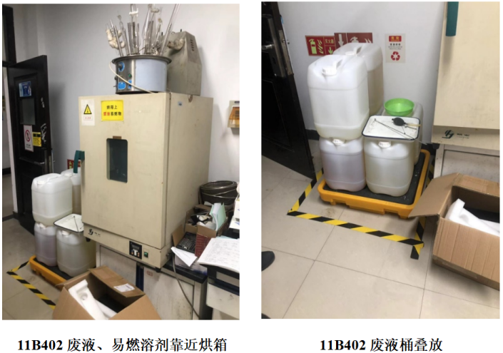 废液桶叠放,废液、易燃溶剂靠近烘箱、烘箱上堆放其他物品 |