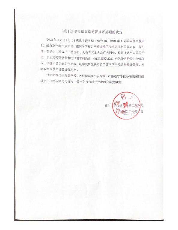 关于给予吴壁同学通报批评处理的决定