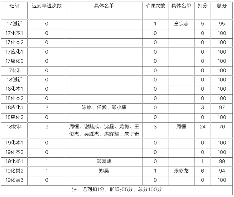 的学风建设、督促学生按时参与线上课程,现对2019-2020学年第二学期第十周考勤情况进行通报。每天由各班负责人统计各科出勤情况并上报,最终一周的考勤情况于每周五进行汇总公布。