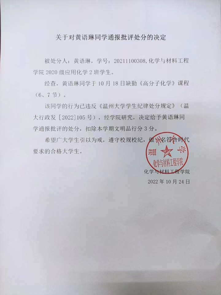 关于对黄语琳同学通报批评处分的决定