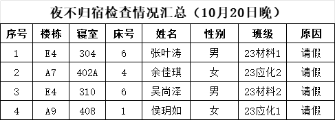 (4)若有学生检查期间未及时返回宿舍,于次日8点到16点之间由本人或委托人至年级辅导员处进行情况说明,逾期将对相关同学进行通报;
